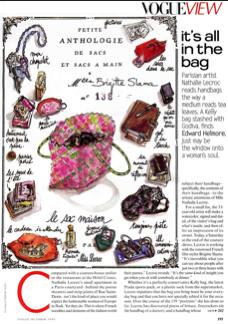Figments, in Providence, RI, seems to have an amazing selection of merchandise – I say “seems” only because I’ve never been. Grace at Design*Sponge featured a gorgeous sofa they have (it’s now sold) and so I clicked over to see what else was new at the website. I found the greatest feature – what’s in her bag – featuring the contents of a purse, artfully laid out and photographed with notes. I adore the latest entry, as Christina’s bag is so elegant! Kind of like bottle reduction applied to one’s handbag. Check it out here. I love this concept so much that I still have a tearsheet from the October 1999 issue of Vogue discussing French artist Nathalie Lecroc’s sketches of handbag contents (see scanned photo above). It was to eventually become a published anthology, and I still hope that eventually, it happens. In addition, there’s Kate Spade’s book, Contents, a collection of photos of handbags and their contents. No matter – I love them all! I’m looking forward to seeing the next handbag feature at Figments.