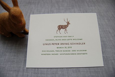Fantastic new work from Sesame Letterpress. I’m always happy to see photos from Matt & Breck pop up in my flickr stream, and their latest work seems especially nature inspired. The announcement for baby Linus could my favorite: it’s so masculine, yet refined, with great use of typeface + color. Very German in feel, which is fitting!