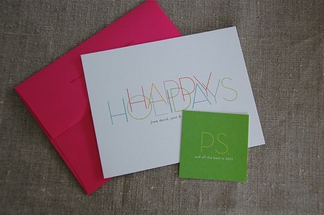 My photo this week is of our 2010 Holiday Card, designed by the ever-brilliant Peggy at bluepoolroad. I love its clean design and playful colors. And of course, I’m wishing every one of you its sentiments: Happy Happy Holidays (and P.S. all the best in 2011). I’ll be back, with something new, on Wednesday, January 5.