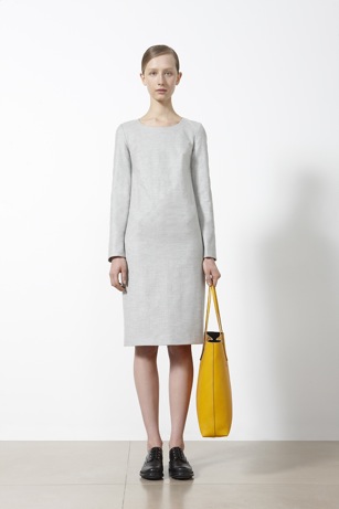 Minimal, minimal, minimal with delightful splashes of color. Two things I’d like to point out: one, you notice the person when clothes are simple like this, and two, that yellow handbag is fantastic! (I really need/want a new handbag.) See the full Jil Sander pre-fall collection at Vogue.com.