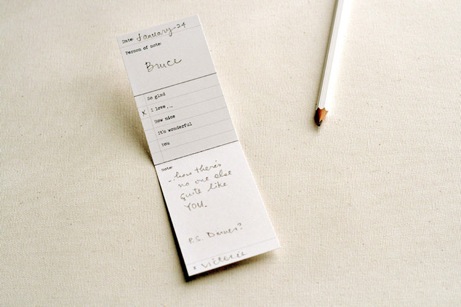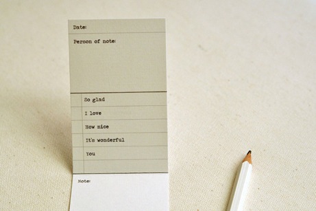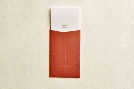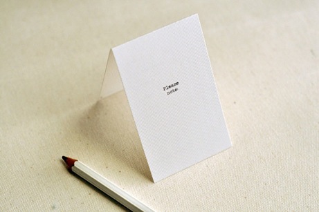 Never underestimate the impact of simple design. These little notes, from LA’s Paper & Type, fold to a mere 2 1/8″ x 3 1/2″. I love them. Sold in sets of five, with kraft envelopes.