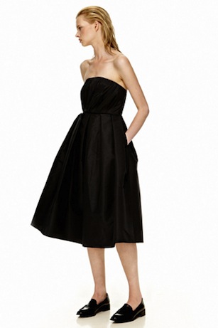 A simple black strapless dress made all the more special by pockets. And loafers. This trend needs to catch on – it’s so tomboyishly fresh. See the complete Tibi resort show at Style.com.