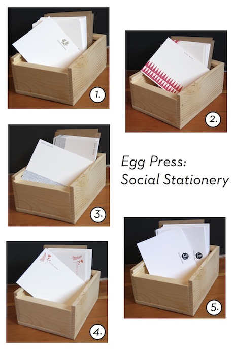 Are you procrastinating on writing your holiday thank-you’s? Perhaps a bit of motivation is in order! Egg Press has launched a new line of social stationery that is guaranteed to make your note writing a bit more cheery. With five patterns to choose from, each set of 50 A2 notecards + kraft envelopes comes personalized with your choice of name or monogram, sweetly packaged in a wooden box.