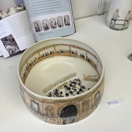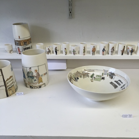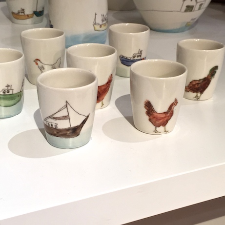 As someone who loves the idea of collections but hates (fears) clutter, artist Helen Beard’s ceramics seem like the perfect compromise. Her illustrated pottery begs to be displayed, but looks and feels like it can withstand use and “love”. I’ve been a fan of Beard’s for a while — I think my first discovery was her simple, elegant bird cups sold at Ashes & Milk. This past weekend, I was fortunate enough to see her pieces thanks to Craft London events at Fortnum & Mason as well as Beard’s studio space at Craft Central in Clerkenwell. (My timing was off and though I had hoped to meet her in person, it didn’t work out: I wanted to hear about her inspirations, and ask about her experience as an apprentice to Edmund de Waal! I did meet Beards’s current apprentice, Tamsin Arrowsmith-Brown and was happy to discover her more minimalist line of ceramics.)