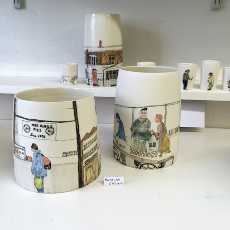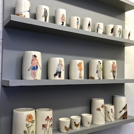 a close-up of beard’s watercolor-illustrated ceramics at her craft central studio, including cylinder vases (front)