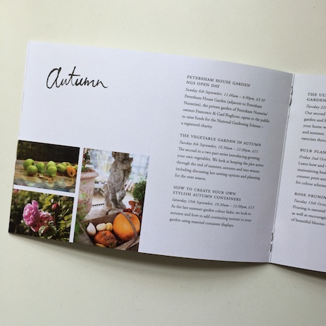 A happy discovery at this year’s GROW London Contemporary Garden Fair was Petersham Nurseries‘ newly-launched “School of Garden Inspiration”. The gorgeous class brochure highlights the wide variety of class options that will to appeal to garden aesthetes whether they’re resident or tourist. Courses range from the serious (vegetable garden planning and rose-bush pruning) to the seasonal (container planting and flower arranging) to my favorite, a series of foraging walks in which an hour-long walk led by a Petersham chef/horticulturist concludes with a light meal at the Nurseries. Sign me up.