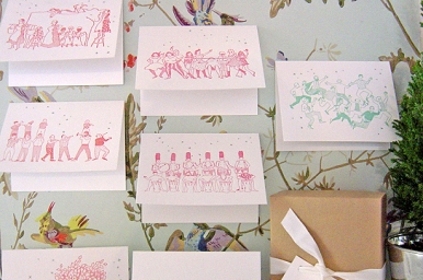 And a quick peek at the illustrations that started it all: Happy’s ’12 Days of Christmas’ cards letterpressed by (now defunct) Black Pearl Press.