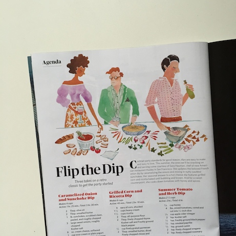 More serendipity: I picked up the current issue of Saveur magazine while in the States and was elated to find Happy’s illustrations atop a party dip story.