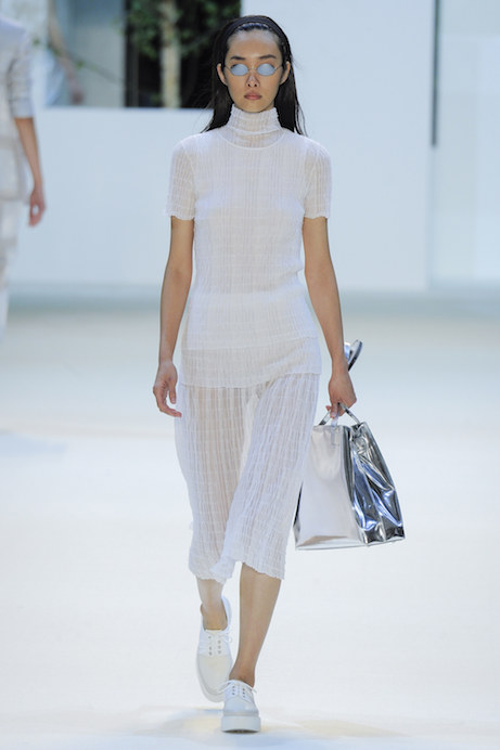 Akris’ spring collection fabrics were a collaboration between head designer Albert Kriemler and architect Sou Fujimoto (Kriemler was inspired by Fujimoto’s design for London’s Serpentine Gallery Pavilion 2013). The visions in white, shown here, are a minimalist’s dream of architectural, utilitarian luxe® gorgeousness. See the complete collection at VogueRunway.com.